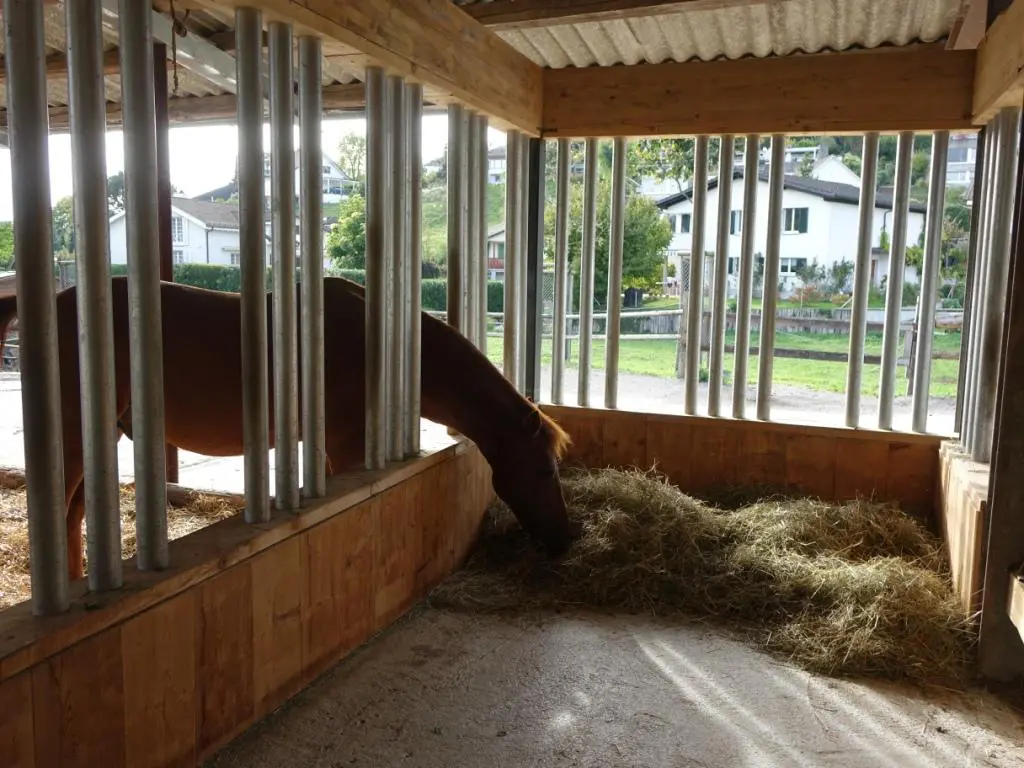 Grosszügiger, moderner, schön Strukturierter Offenstall mit sehr viel Weidemöglichkeiten und nachts mit grosszügigen Einzelboxen. Toller grosszügiger Reit- und Springplatz mit festen und fallenden Hindernissen, grosser Longierzirkel und wunderschönes Ausreitgebiet. Kleiner Reitplatz im Dorf kann gegen Aufpreis ganzjährig mitbenutzt werden.