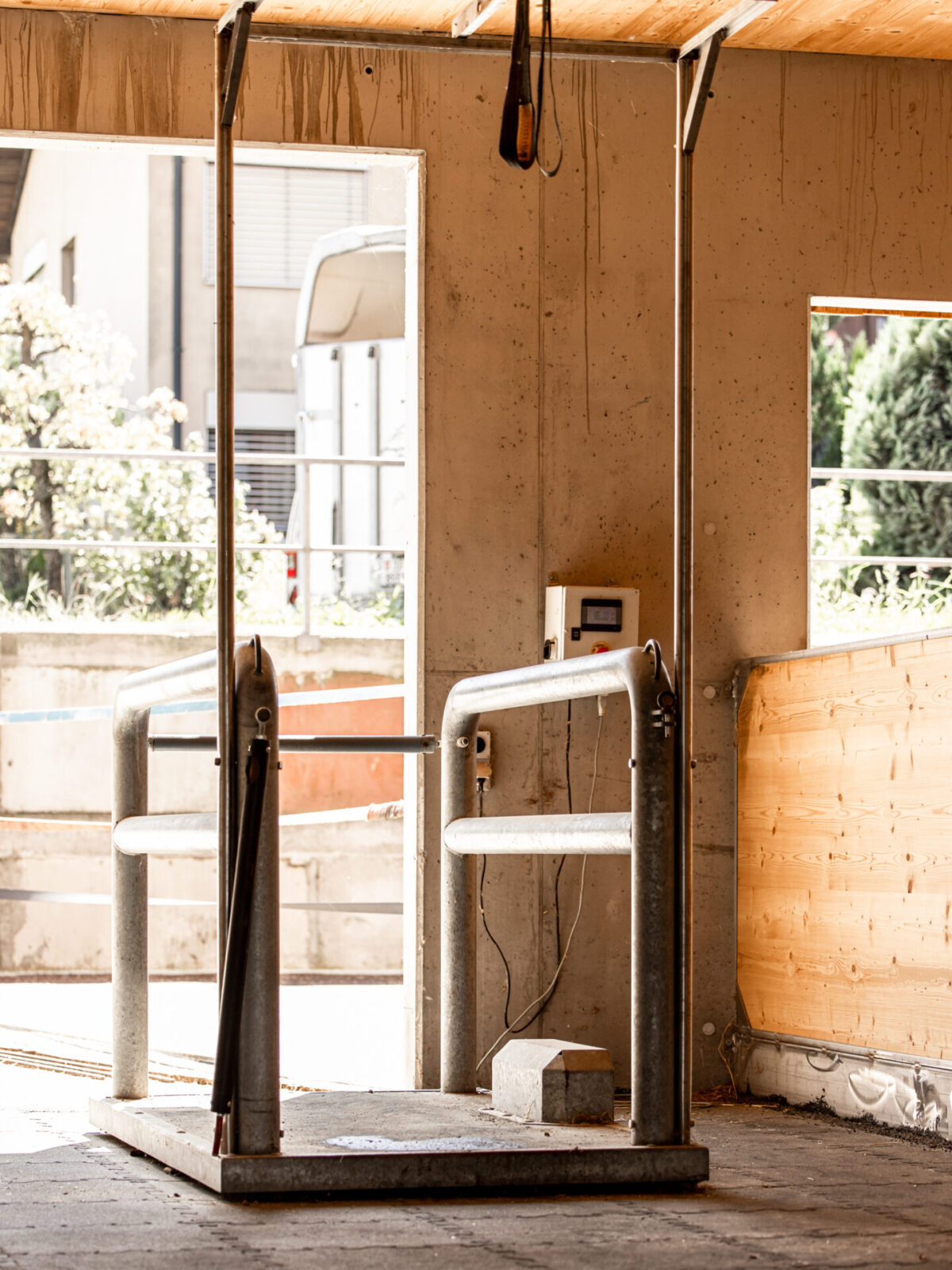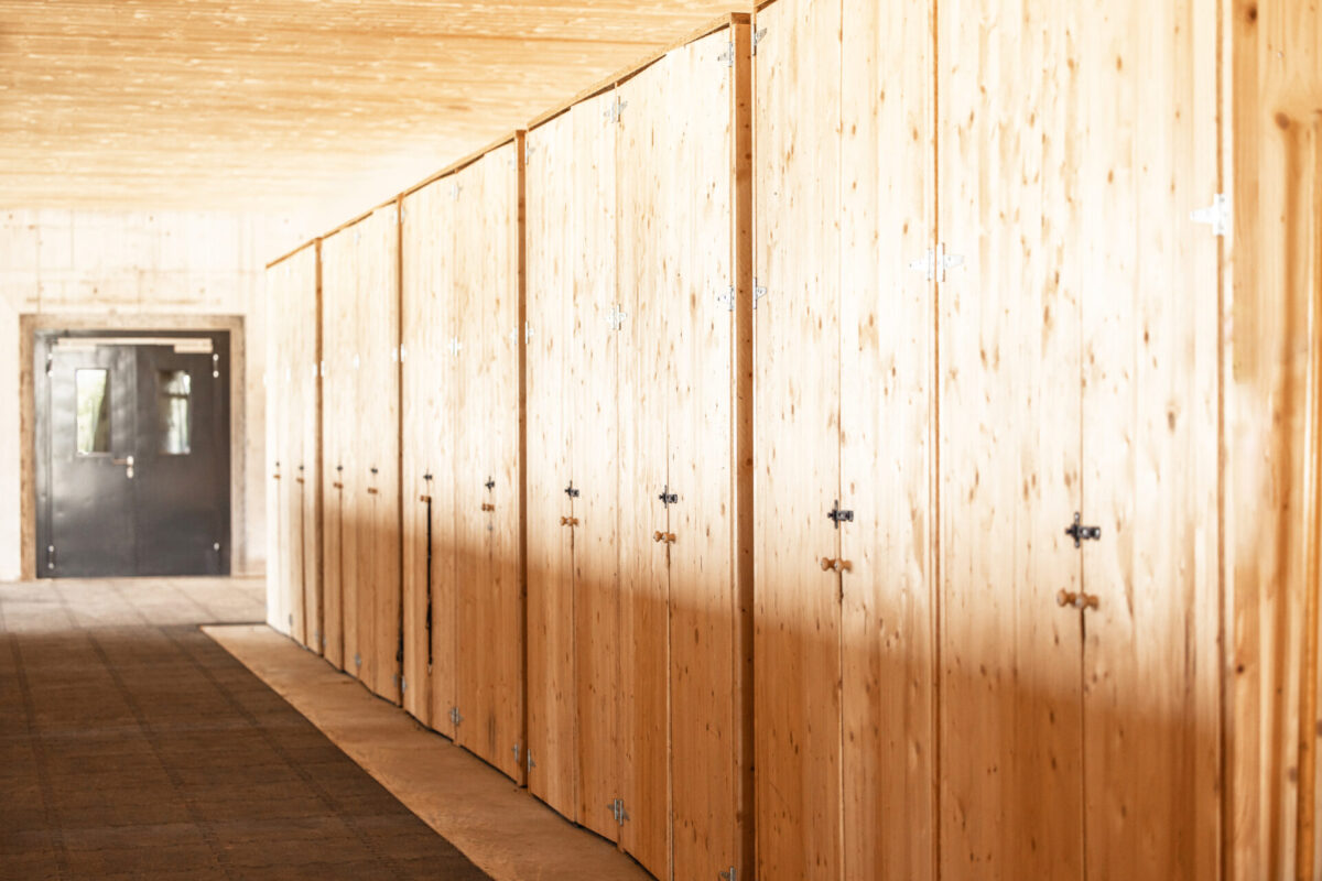 Auslaufboxen 4.5x3m mit 24m2 befestigem Auslauf. Die Boxen sind mit Gummi ausgegossen, der Auslauf besteht aus gummierten Puzzlematten