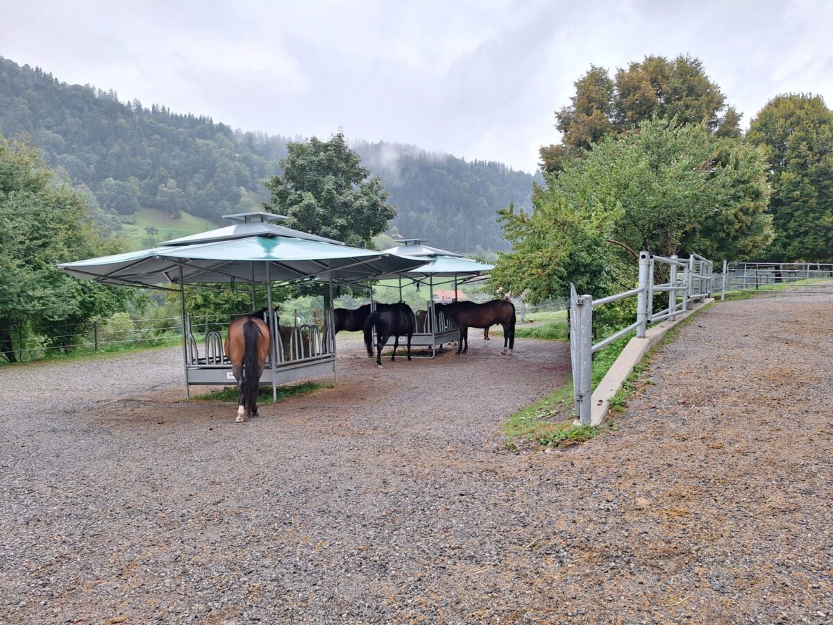 Zufütterung auf Wunsch, ad-Libitum Fütterung (2 grosse Raufen mit Zeltdach sind permanent zugänglich), grosszügiges einstreuen mit Leinenstroh, täglicher Zugang zu den Weiden (oder 4-5 Mal pro Jahr) mindestens Auslauf auf den großzügigen Festplatz, zwei Ställe permanent zugänglich, Integrationsstall und Pflegeboxe vorhanden.