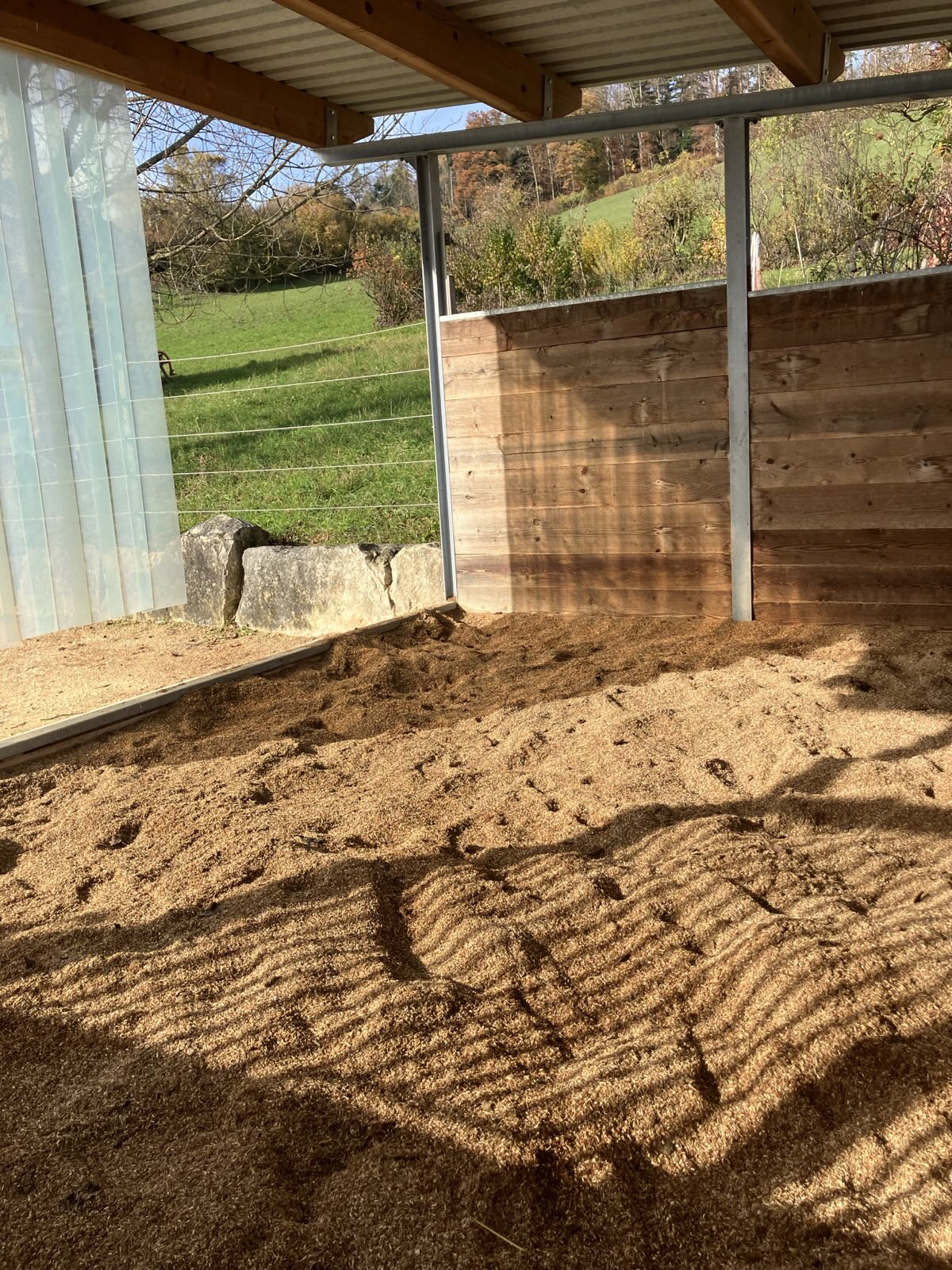 Zudem steht eines unserer Pferde auf der Warteliste für die Altersweide, daher wird in absehbarer Zeit auch eine grosse Einzelbox mit Auslauf und Liegefläche mit Langstroh frei.