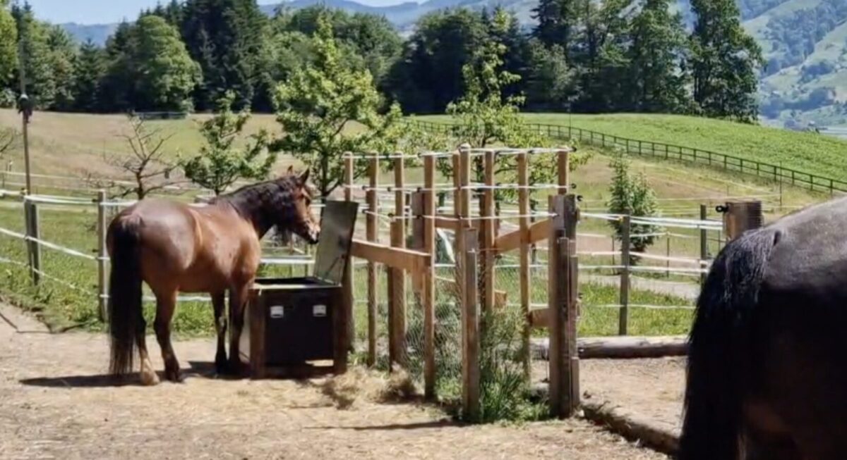 Ein weiterer grosser Pluspunkt ist unser weitläufiger Paddocktrail, der Sommer wie Winter genutzt wird. Je nach Witterung ist er etwas grösser oder kleiner, aber die Pferde haben das ganze Jahr viel Bewegungsmöglichkeit, was sie sehr ausgeglichen macht. Dazu kommen unsere automatisierten Einzelfutterplätze (freistehende Kisten), damit jedes Pferd möglichst in Ruhe fressen kann und es weniger Futterstress und Verletzungen gibt.