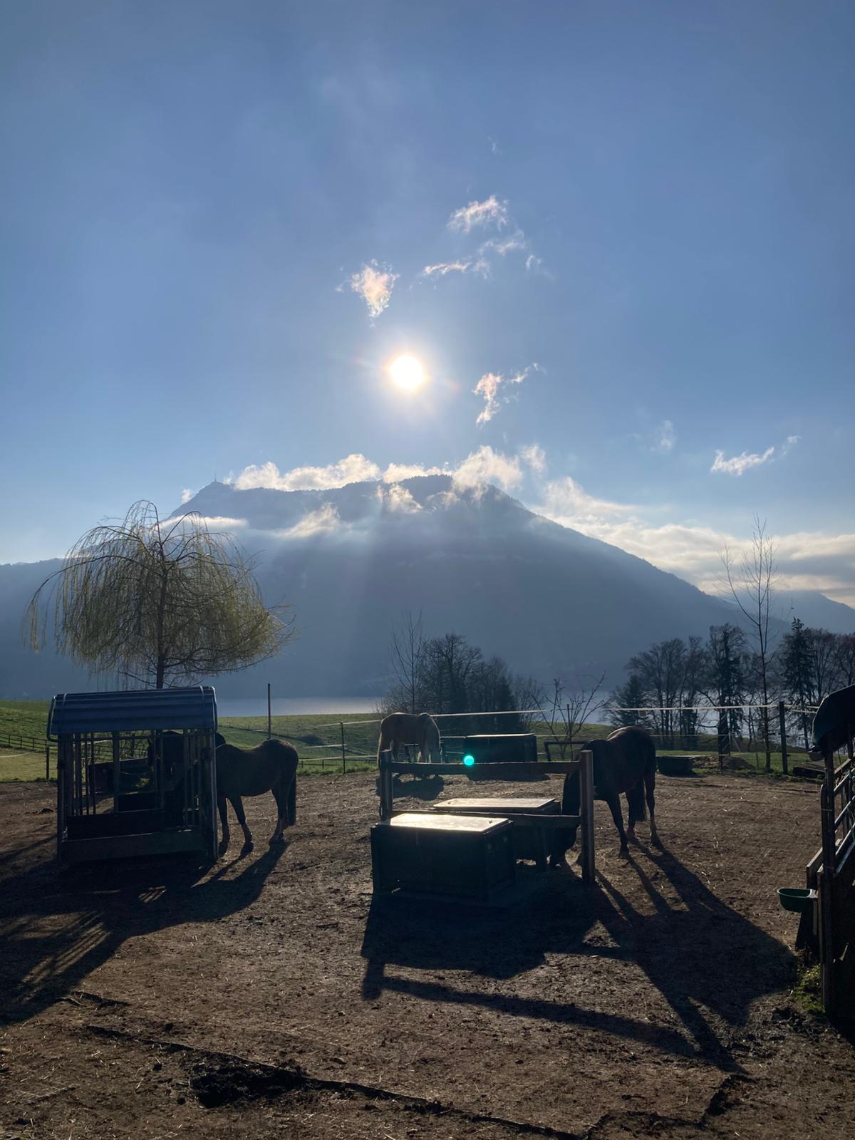 In unserem Allergiker-Offenstall in Merlischachen SZ ist per sofort ein Platz frei. Der Stall liegt oberhalb vom Vierwaldstättersee auf knapp 600 m Höhe, nur wenige Minuten vom Meggerwald entfernt. Dort erwartet dich ein tolles, weitläufiges Ausreitgebiet. Unsere leicht erhöhte Lage führt zu einer geringeren Atemwegsbelastung für die Pferde und etwas kühleren Temperaturen.